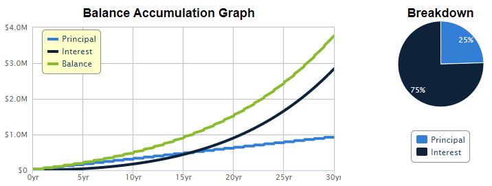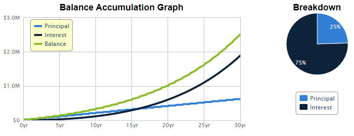 In this scenario, 50% means you are investing $10,250 a year into your S&P 500 Mutual fund with 8% growth per year. Below shows the growth of your money over 30 years.