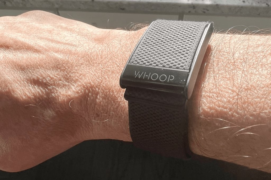 The Whoop 4.0 is a wearable fitness tracker. Its goal is to optimize your exercise and recovery time by tracking metrics like body temperature, heart rate, sleeping patterns, blood oxygen levels, and respiratory rate. From these metrics, Whoop has created software to calculate recovery time, required sleep, and strain score.