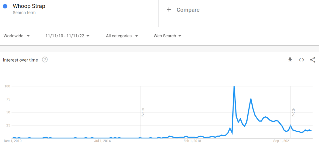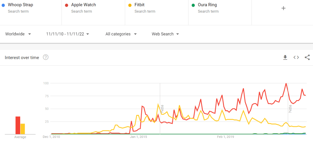 Although Whoop has support from athletes like LeBron James, Michael Phelps, Rory McIlroy, Patrick Mahomes, and Kevin Durant. You can see in the image below that the brand recognition of Apple and Fitbit is extremely dominant. The graph shown is a simple comparison of buzzwords involving the four products covered in this report.